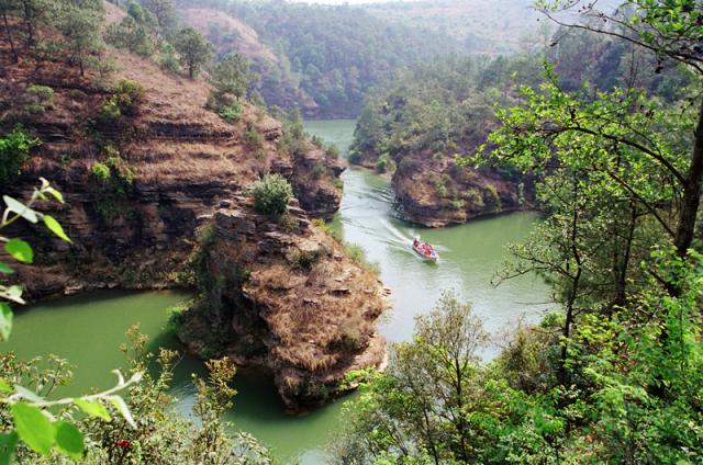 如若泛一叶小舟前行,欸乃声声,轻风习习,悠闲自在的你懒懒地坐在船头,或掬一捧清水抛向高远,开出朵朵水花,溅起片片涟漪;或慢慢地欣赏两岸绵延不断的奇峰异石、绝崖峭壁、古木藤蔓,还可观苍鹰盘旋天空、鹭鸶浅戏水中、燕子近空穿飞,偶遇一叶扁舟满载羊群过河,更觉妙趣横生。要是你心血来潮,即兴哼哼“小小竹排江中游,巍巍青山两岸走”的歌词,那也是一份自得的享受、忘我的畅游……