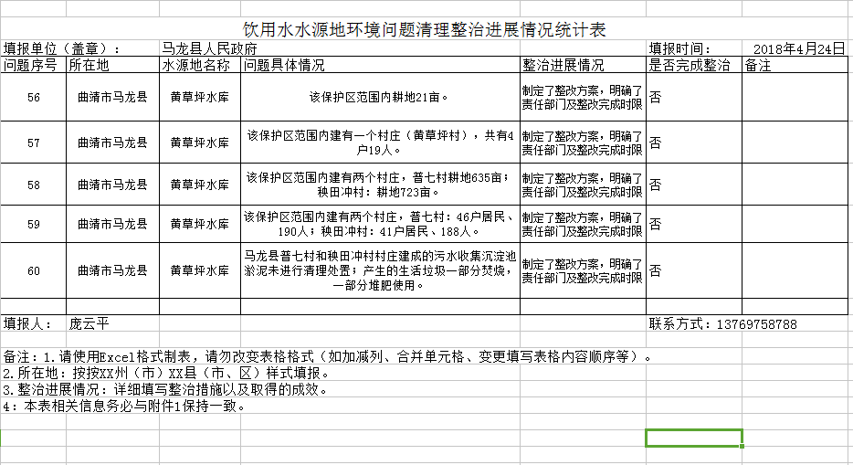 饮用水水源地环境问题清理整治进展情况统计表 (马龙2018.4.24)