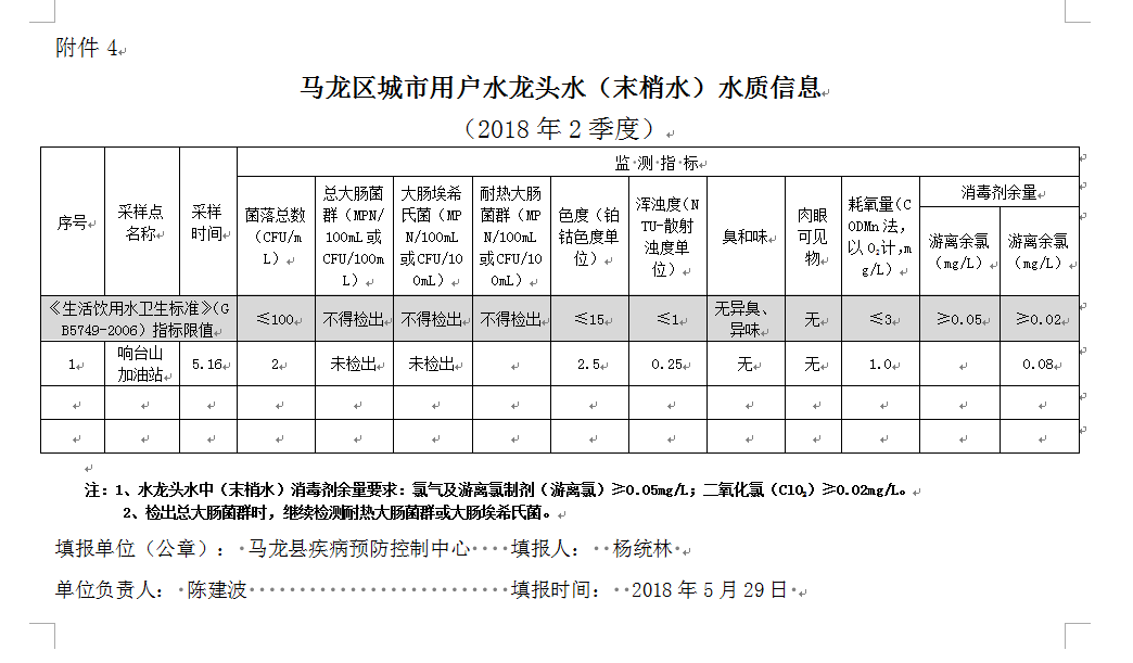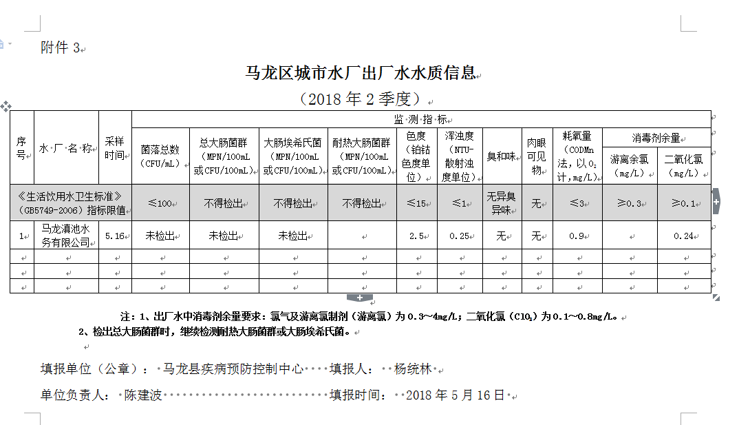 马龙区城市水厂出厂水水质信息(2018年2季度)
