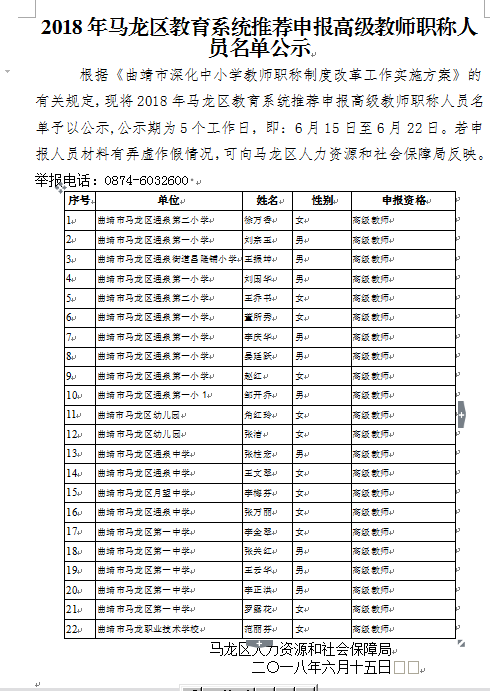 2018年马龙区教育系统推荐申报高级教师职称人员名单公示