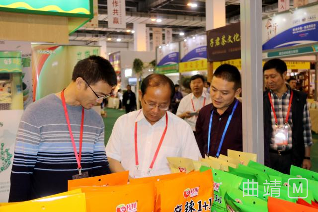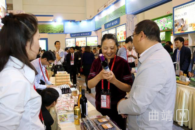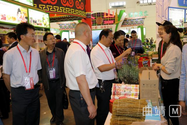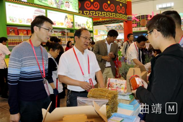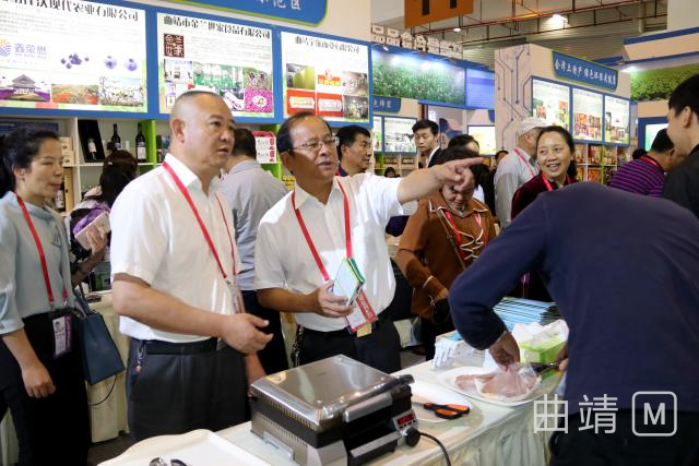 在马龙参展企业展位前,李伟、张晓芬等区领导一边听取参展企业的情况汇报,了解企业产品参展、经贸洽谈情况,一边查看参展的土鸡蛋、水果、苦荞茶、雪花牛肉、普洱茶酒、电机壳、法兰盘等产品,并不时与展位前的采购商交流,介绍马龙的经济社会发展状况及交通、区位、土地、生态等优势,主动邀请客商到马龙参观考察。