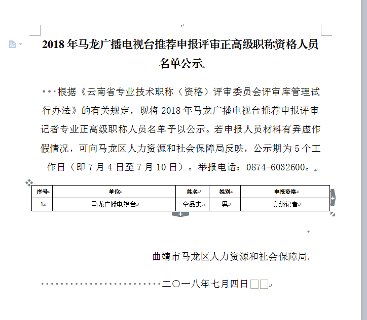 2018年马龙广播电视台推荐申报评审正高级职称资格人员名单公示